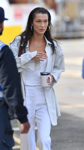 Давно мы не видели образы Беллы Хадид — девушка проходила серьезное лечение. Но пришло время возвращаться, и сделала это знаменитость в своем стиле: модно и необычно. Она была замечена в трендовом образе, который предлагаем вам повторить прямо сейчас. Белла примерила белоснежную майку с бантиком, бриджи в духе 90-х и накинула на плечи удлиненную рубашку. Невозможно не заметить и актуальные балетки, которые в этом году носили самые модные девушки. Завершила она выход аксессуарами: сумкой, ободком и украшениями.