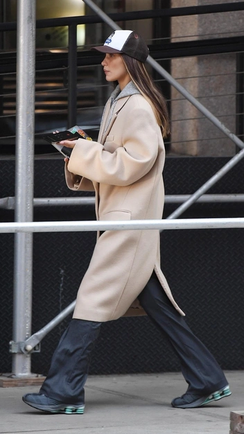 Белла Хадид — икона стиля, которая всегда выглядит идеально, что бы она не надела. На этот раз супермодель появилась в лаконичном аутфите, для которого она выбрала объемное худи и расслабленные струящиеся брюки. Акцентом в нем стало безупречное фактурное пальто в благородном бежевом оттенке. Завершила выход Белла Хадид ультрамодными кроссовками, рюкзаком и кепкой, которую скоро будем носить и мы.