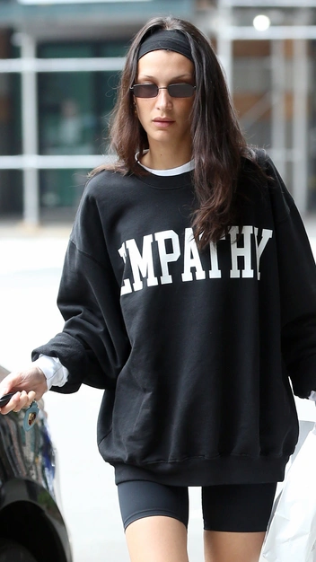 Одна из любимых формул леди Ди, велосипедки в сочетании с объемным свитшотом, сейчас актуальна как никогда. Белла Хадид тоже не смогла удержаться от такого комфортного аутфита и собрала его в черном цвете. К велосипедкам и толстовке модель добавила белые кроссовки, высокие носки, широкую повязку на голову и солнцезащитные очки.