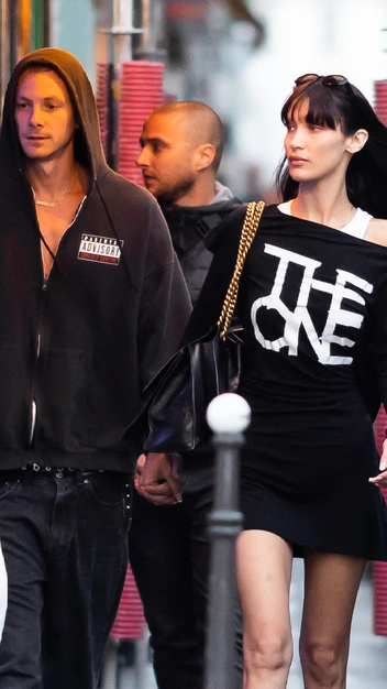 Белла Хадид продолжает обращаться к трендам прошлых модных эпох. На прогулке с бойфрендом в Париже фотографы заметили модель в черном платье асимметричного кроя, с длинным рукавом и надписью спереди, надетом поверх белой майки-алкоголички. К платью селебрити добавила туфли с круглым мысом на высоком устойчивом каблуке и вместительную кожаную сумку на ручках-цепочках.