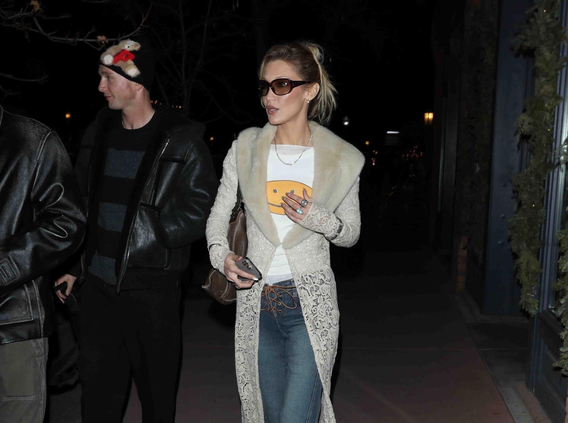 В Аспене Белла достает из сундука нулевых удлиненный кардиган и показывает нам, как носить его в 2026‑м: поверх серого лонгслива с ироничным принтом модель накидывает кружевной кардиган‑халат с меховым воротником из нью-йоркского винтажного бутика Nünü Vintage, добавляет джинсы со шнуровкой и остроносые казаки, а поверх всего этого — цепочку с бриллиантами. И главный акцент — потерянная где-то между 2002‑м и 2026‑м «правильная небрежность», окончательно превращая Y2K‑аутфит в киношный зимний ромком‑лук и одновременно подтверждая возвращение макси‑кардиганов в список ключевых трендов сезона.