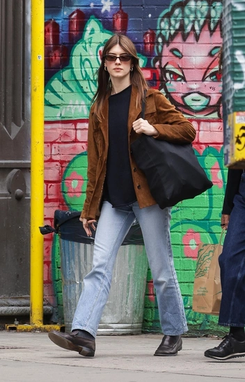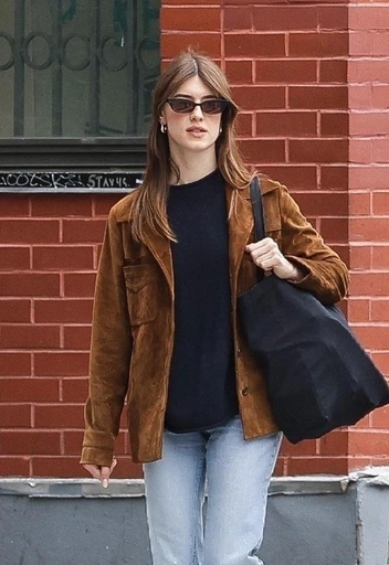Если хочется разнообразить офисный лук, то добавьте в него интересный пиджак. Именно так поступила актриса Дейзи Эдгар Джонс, надев замшевый вариант интересного кроя.
