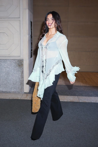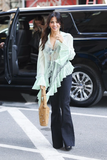 Дженна показывает, как сделать романтичную (и даже сказочную) блузу абсолютно идеальным вариантом для города: полупрозрачный топ в оттенке тиффани с кружевом и каскадом плиссированных воланов она сочетает с простыми черными расклешенными джинсами, сбивая излишнюю нежность и превращая ее в стильный контраст. Замшевая сумка‑ведро добавляет теплой фактуры и чуть бохо‑настроения, так что итоговый аутфит выглядит как идеальный рецепт весеннего выхода, когда один эффектный верх берет на себя всю модную работу.