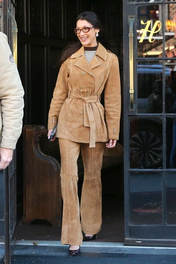 В 2024 году Белла Хадид делала ставку на образ «девушки ковбоя», которая носит широкие шляпы оттенка камел, замшевые казаки и джинсы с низкой талией даже на модные ивенты. Но к середине декабря ее образы начали трансформироваться в пользу более делового стиля. Например, в этом замшевом костюме модель появилась в Нью-Йорке. Она сочетала его с очками в стиле Miu Miu и лодочками с острым мысом, которые, казалось, исчезли из ее гардероба.