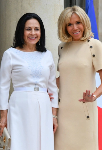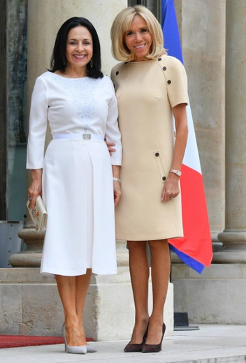 В Елисейском дворце приняли почетных гостей из Эквадора: с официальным визитом в столицу Франции прибыли эквадорский президент Ленин Морено и его жена Росио Гонсалес. По этому случаю обе первые леди примерили элегантные созвучные наряды, которые с одобрением встретили модные критики. Брижит предпочла кремовое мини-платье с пуговицами, которое эффектно дополнили туфли-лодочки шоколадного оттенка, а госпожа Росио вышла в классическом белом платье с вышивкой в зоне декольте и поясом на талии. Образ завершили серые туфли-лодочки.
