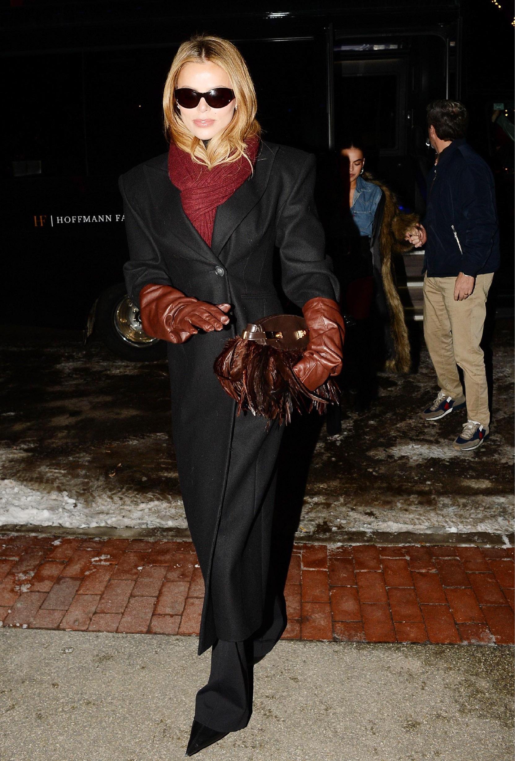 Брукс Нейдер «подчинила» себе самый сложный тренд сезона — объемные удлиненные перчатки: поверх строгого черного пальто она надевает гигантские кожаные рукавицы коньячного оттенка, подчеркивая их бордовым трикотажным шарфом‑воротником и сумкой‑клатчем с перьями, так что даже базовый total black превращается в модный манифест о том, как правильно носить перчатки и не выглядеть изшлишне театрально.