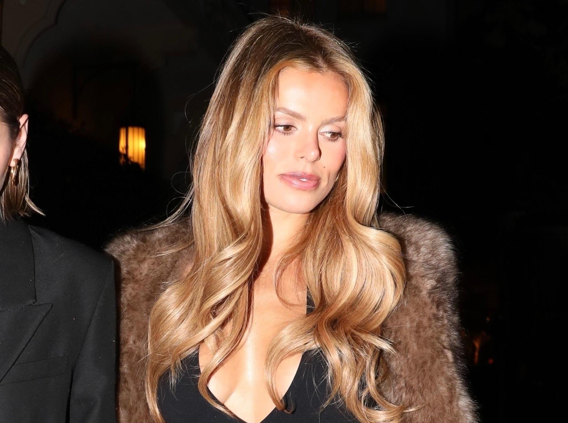 Модель делает меховую горжетку главным героем образа: плотный коричневый мех мягко обрамляет открытую линию декольте и создает настроение старого голливудского гламура поверх самых обычных винтажных джинсов. Черный боди и лодочки в тон вытягивают силуэт, а миниатюрная сумка добавляет современный акцент — в итоге мех здесь не про «роскошный люкс», а про эффектный аксессуар, который за секунду превращает базовый деним в вечерний выход.