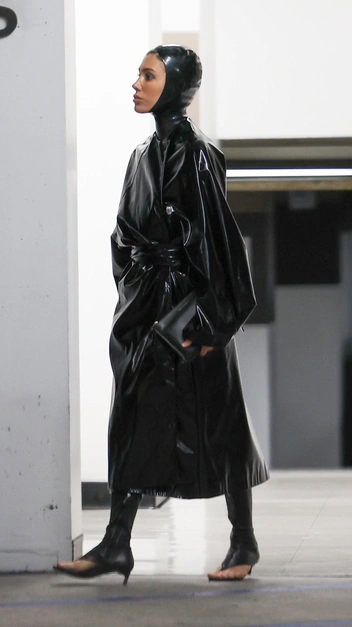 Мы уже привыкли к эпатажному стилю Бьянки Цензори, за который отвечает Канье Уэст. В этот раз знаменитость показала, что тотал-черный все еще выглядит эффектно и может удивлять. Девушка была замечена в ультрамодном латексном луке. Кожаный тренч перекликается с футуристичным чепчиком, который превращает ее в инопланетную героиню. Она завершила выход необычными сапогами с открытым мысом, о которых мечтают многие модницы.