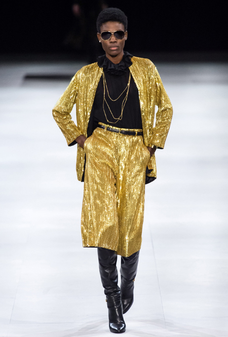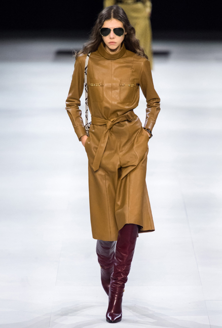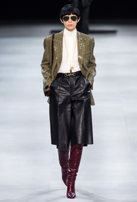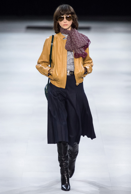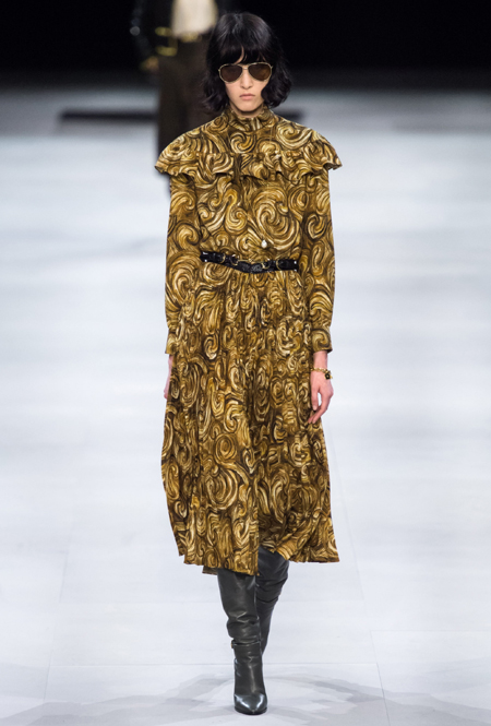 Скандалов на прошедших неделях моды было мало, однако кое-что для любителей горячих обсуждений все-таки произошло. Эди Слиман продолжает интриговать публику на посте креативного директора обновленного Celine и на этот раз, казалось бы, фантазировал в совершенно новом для себя направлении. Дизайнер взял за основу архивные коллекции Celine 70-х и переработал их на свой лад, представив классические кейпы, облегающие синие джинсы, костюмы и расклешенные миди-юбки.