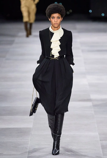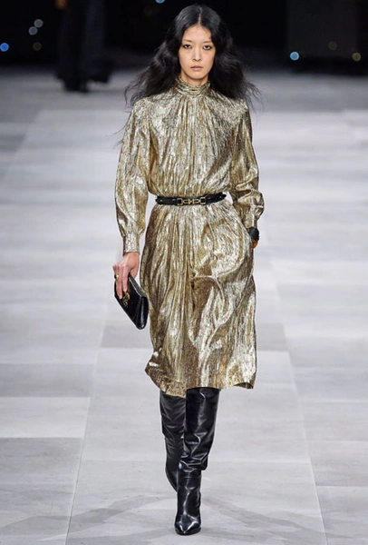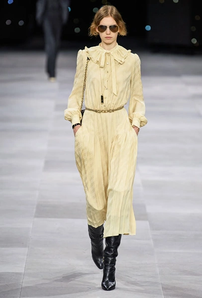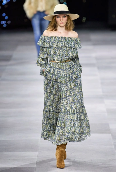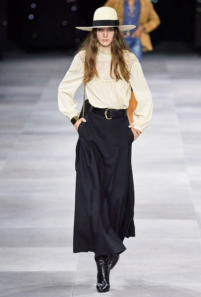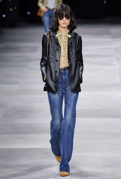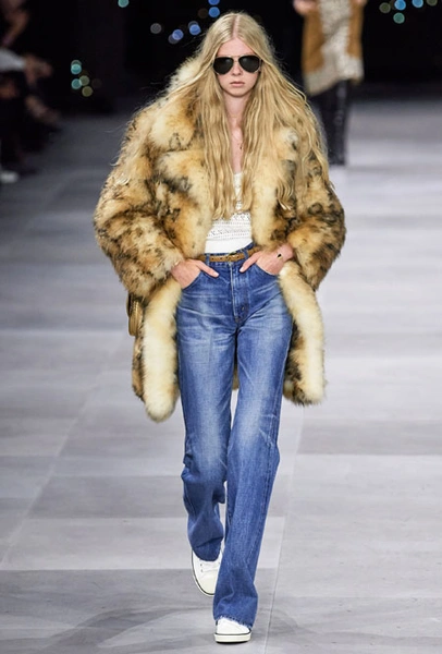 В основе новой коллекции креативного директора бренда Эди Слимана – богемный шик 70-х. Из этой эпохи дизайнер вернул на подиумы брюки-клеш из синего потертого денима, шелковые платья и струящиеся блузы, объемные пушистые шубы, юбки со складками ниже колена и а также кожаные ботфорты. В тренды Слиман возвращает и тонкие ремни – как минималистичные из кожи, так и пояса-цепи.