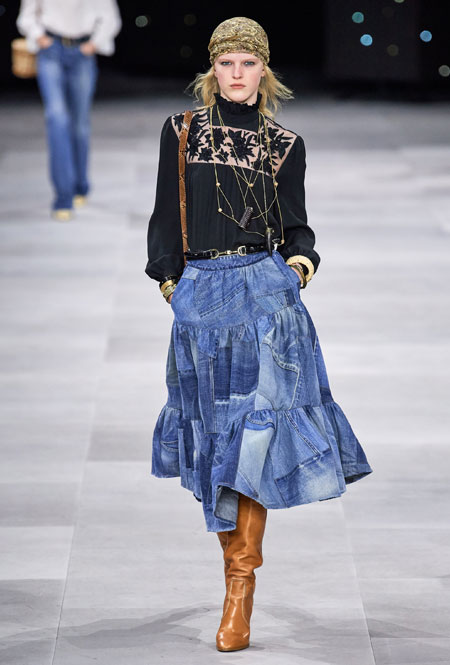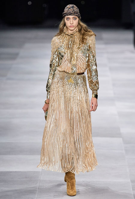 В основе новой коллекции креативного директора бренда Эди Слимана – богемный шик 70-х. Из этой эпохи дизайнер вернул на подиумы брюки-клеш из синего потертого денима, шелковые платья и струящиеся блузы, объемные пушистые шубы, юбки со складками ниже колена и а также кожаные ботфорты. В тренды Слиман возвращает и тонкие ремни – как минималистичные из кожи, так и пояса-цепи.