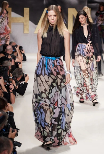 При мысли о культовом доме Chanel сразу представляешь твидовые жакеты 60-х, маленькие черные платья и вневременной гламур. В новом сезоне креативный директор Виржини Виар решила вновь обратиться к архивам Дома и показать, насколько универсальны вещи, представленные еще в прошлом веке. На подиуме дизайнер представила черно-белые купальники, яркие твидовые пиджаки и, конечно же, культовую монограмму Chanel, которая украшала многие наряды. Важную роль в новой коллекции сыграл металлик, который обещает стать хитом сезона, а также необычные кожаные вещи.