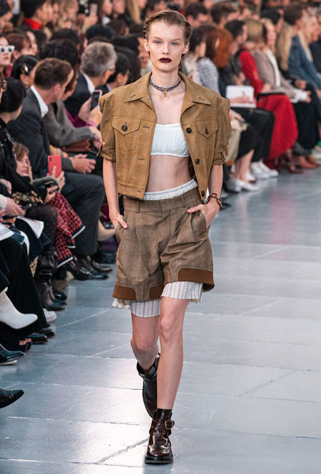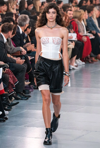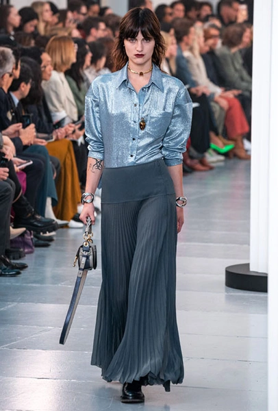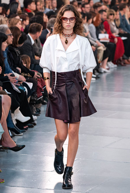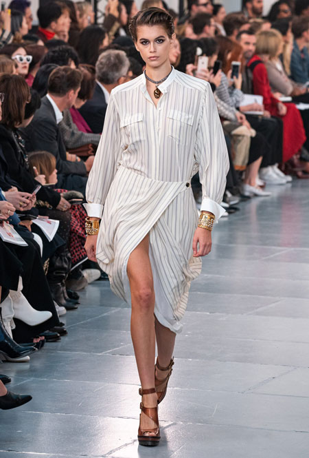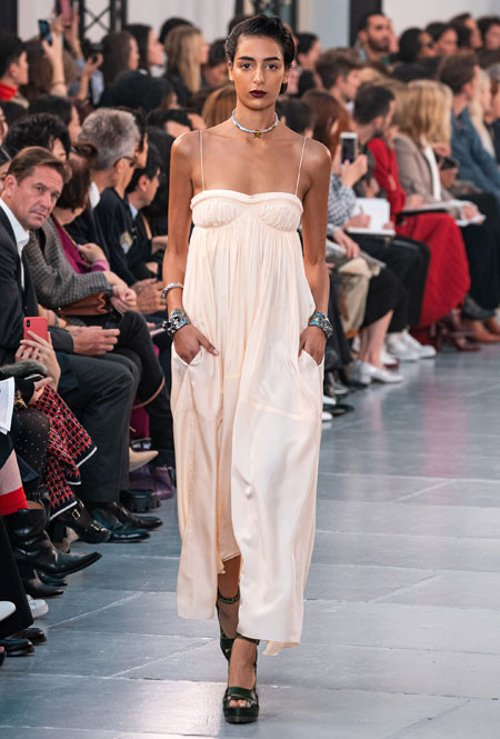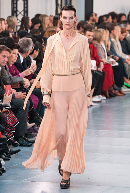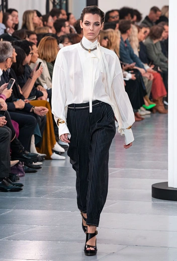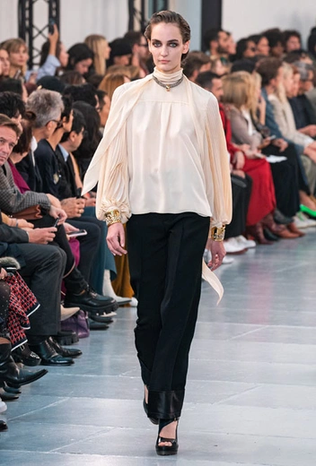 Гардероб нового сезона был выполнен в излюбленной палитре бренда: бежевом, белом, персиковом и оттенке айвори. Поэтому вещи из коллекции легко сочетать друг с другом, создавая универсальную капсулу, которая не надоест с течением времени. На подиуме Наташа Рамсей-Леви экспериментировала с кодами парижского Дома, приправив все это тенденциями 70-х, отсылками к Викторианству и стилем сафари. Дизайнер представила летящие платья персикового оттенка, объемные струящиеся блузы с высокими воротниками, укороченные куртки с контрастной строчкой, бельевые топы и костюмы в тонкую полоску.