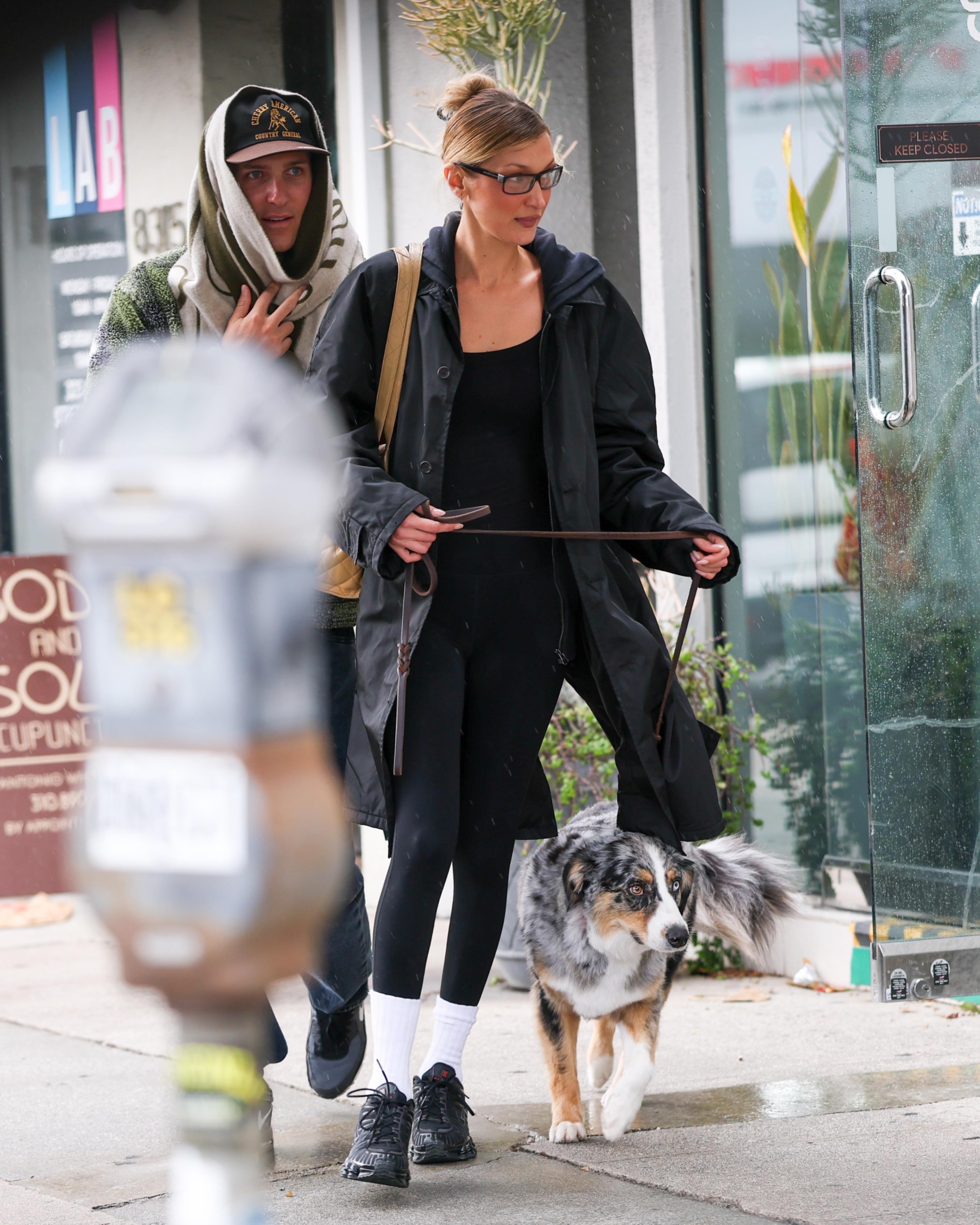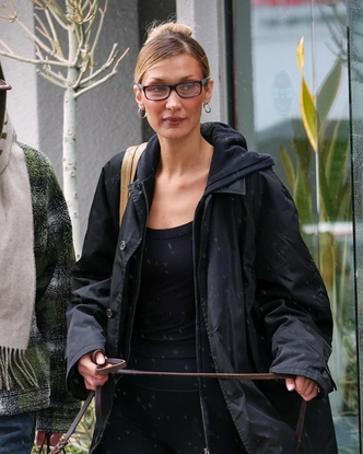 Даже на утренней прогулке с собакой Белла Хадид выглядит идеально: монохромный комплект из леггинсов, топа и удлиненной парки превращает обычный образ в выверенный городской аутфит. Белые носки, выглядывающие из массивных кроссовок, добавляют модной спортивной иронии, а строгий пучок, минималистичные серьги и практичная сумка собирают образ воедино и доказывают, что у модели off‑duty нет «случайных» выходов — даже дождливая прогулка с любимым питомцем превращается в стритстайл‑кадр.