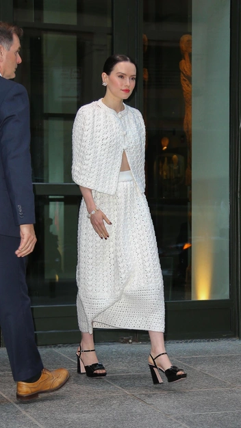 От Дейзи Ридли не оторвать взгляд — знаменитая актриса была замечена в бесподобном белом вязаном костюме. Она выбрала для вечернего выхода вязаный комплект, который состоит из укороченного кейпа с крупными мягкими пуговицами и миди-юбки на высокой посадке. К нему звезда серии фильмов «Звездные войны» подобрала черные босоножки на толстом каблуке и крупные украшения.