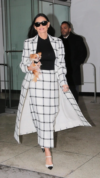 Деми Мур для своих образов выбирает элегантность и классику, но при этом каждый раз она эффектно добавляет в них акценты. Например, недавно голливудская звезда была замечена в роскошном костюме. Она примерила черный бадлон, который заправила в белую юбку-карандаш с небольшим разрезом, декорированную черной клеткой. С ней гармонично перекликаются прямое пальто и туфли в черно-белом цвете.