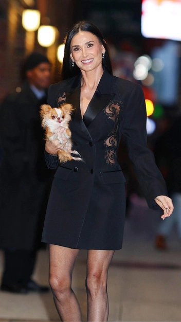Знаменитость устроила настоящий модный тур в Нью-Йорке: каждый день — новый стильный аутфит. На этот раз Деми Мур примерила эффектное платье-пиджак, показав, что такой силуэт все еще остается в тренде. Она отдала предпочтение модели приталенного кроя и длине миди, подчеркнув безупречную фигуру и стройные ноги. К наряду актриса подобрала лаконичные слингбэки и серьги с бриллиантами.