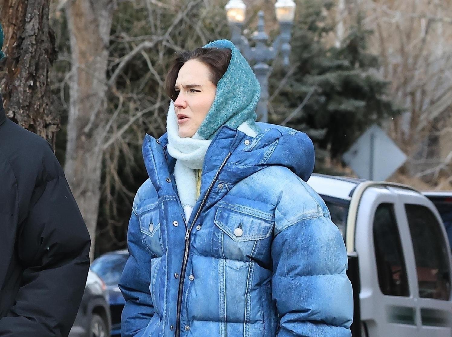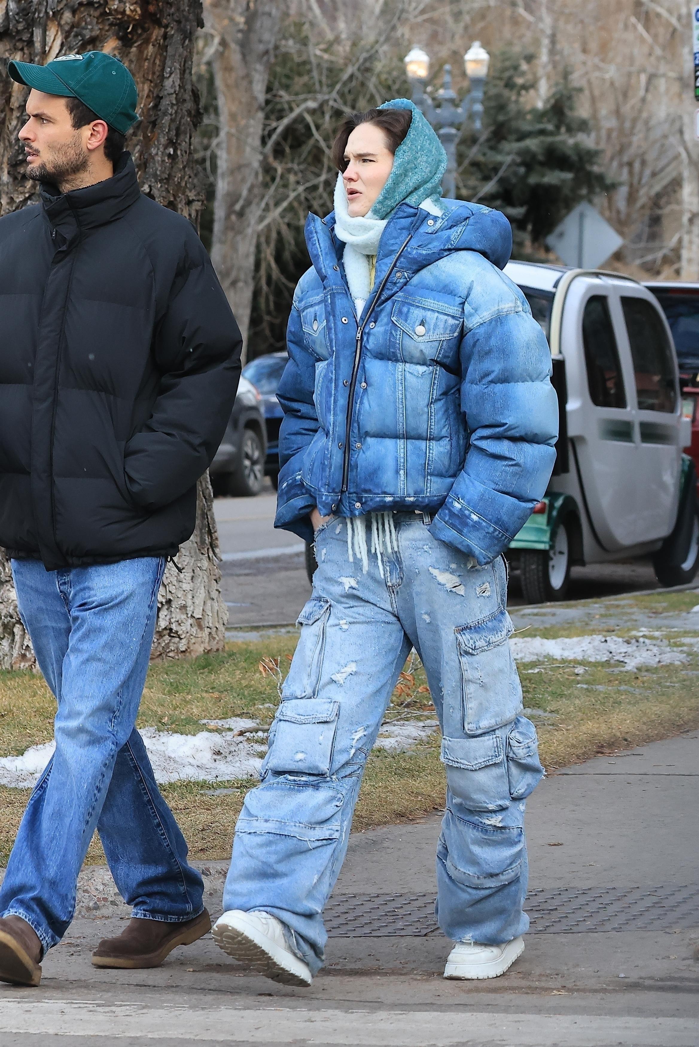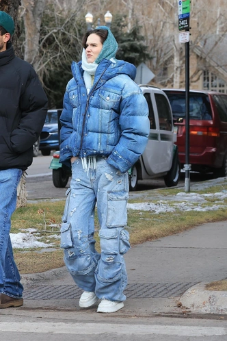 Софи Хоули‑Уэлд выводит деним на новый уровень: стеганый джинсовый пуховик и мешковатые карго‑джинсы с латками и карманами превращают ее в настоящую героиню видеоигры про зимнего персонажа, который случайно попал на стритстайл‑съемку. Объемный шарф‑балаклава и массивные кроссовки поддерживают оверсайз‑силуэт, а монохромный голубой делает весь комплект неожиданно цельным, несмотря на максимально непривычные детали.