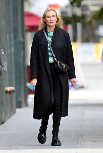 Собрать идеальную базу гардероба — важное дело, которое в будущем точно облегчит жизнь. Во-первых, универсальные вещи лаконичного кроя идеально сочетаются друг с другом, причем совсем не важно, какие цвета превалируют в вашем гардеробе. Во-вторых, собрав правильную основу, вы сможете «нанизывать» на нее актуальные тренды и всегда быть уверенной, что ваши образы выглядят актуально и современно. Многие звезды уже составили для себя идеальную базу, поэтому нам точно есть, на кого ориентироваться. Отличный пример нам подает Диана Крюгер. Папарацци засняли звезду на улицах Нью-Йорка в стильном и практичном образе — оверсайз-пальто прямого кроя, топе в полоску и скинни-джинсах в паре с грубыми ботинками на рифленой подошве.