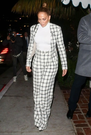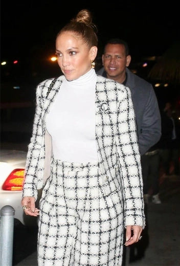 Твид стал одним из ключевых материалов как весенне-летнего, так и будущего осенне-зимнего сезонов. Самым передовым брендом в создании безупречных вещей, конечно, уже давно стал Chanel. Французский модный дом представляет твидовые костюмы в каждой коллекции, и одну из таких новинок на днях выгуляла самая обсуждаемая модница Голливуда – Дженнифер Лопес. Костюм в клетку с укороченным жакетом и свободными брюками-клеш – идеальный лук для ужина со своим возлюбленным Алексом Родригесом.