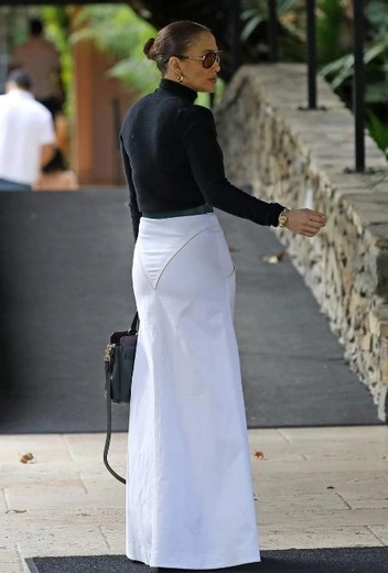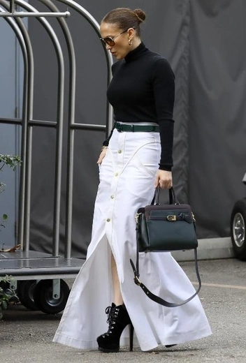 Для Джей Ло холодные месяцы — не повод отказываться от элегантных выходов и утепляться в урон женственности. Исполнительница нашла для себя универсальный способ, как обеспечить нужную тональность образа без использования не по сезону легких вещей. Красотка делает ставку на black&white и примеряет практичное сочетание юбки макси на пуговицах с разрезом и базовой водолазки, дополненное полусапожками на высоком каблуке. Аутфит завершают классическая сумка-тоут в тон обуви, солнцезащитные очки и золотые украшения.