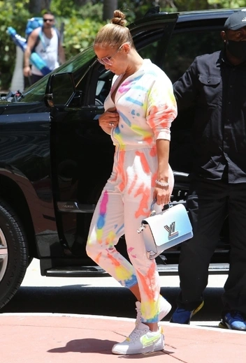 Джей Ло никогда не боится экспериментировать с цветовой гаммой и часто пополняет наш мудборд интересными колор-вариантами для повседневных образов. Стритстайл нового сезона певица начинает максимально ярко, делая ставку на многоцветность в своих casual-выходах. Звезда примеряет слитный брючный костюм на молнии в полуспортивном стиле в абстрактном разноцветном принте, который дополняет кроссовками в тон костюма и бело-голубой сумкой Louis Vuitton. Лопес завершает лук любимыми солнцезащитными очками и тугим пучком.