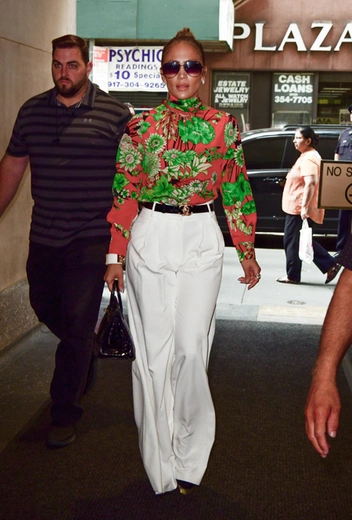2 августа в Нью-Йорке была замечена Дженнифер Лопес, компанию которой составил ее возлюбленный, бейсболист Алекс Родригес. Дженнифер не из тех звезд, что экспериментируют со стилем: образы латиноамериканской дивы каждый раз предсказуемо женственные и нарядные. Например, этот: цветная блуза, белые брюки-палаццо и тонкий кожаный ремень от Chanel — просто ода женственности.