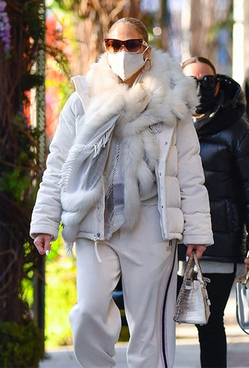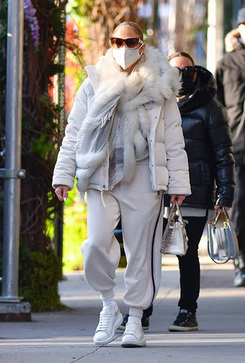 В новогодние праздники у нас есть не так много сил и желания наряжаться. Правда, выглядеть стильно все равно хочется. Дженнифер Лопес нашла рецепт – тотал-луки в единой гамме, которые легко составить за несколько минут, но при этом такие наряды выглядят достаточно актуально и уместно для появлений на публике. Для короткой прогулки по Нью-Йорку она выбрала расслабленные спортивные джоггеры, белые кроссовки и молочный пуховик, дополненный меховым шарфом.