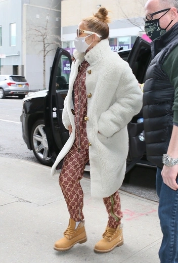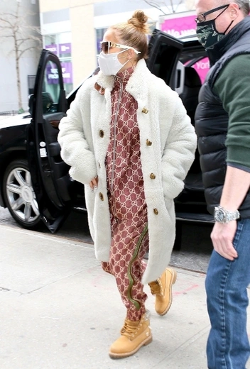 Для повседневного стритстайла исполнительница чаще всего выбирает удобные брючные костюмы в полуспортивном стиле, но иногда делает исключение в пользу более утонченных casual-вариантов. Костюм Gucci в моно-принте кирпичного оттенка знаменитость примеряет в комбинации с любимыми тимберлендами и белым меховым пальто на пуговицах. Джей традиционно дополняет аутфит солнцезащитными очками с белой оправой и защитной маской.