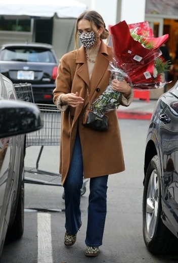 На этой неделе Джессика Альба отправилась на рождественский и новогодний шопинг — любимое занятие большинства голливудских звезд, для которых Адвент — время семейных вечеров без рабочей суеты. Для главного шопинга в году Джесс подбирает стильный casual-образ в нюдовой палитре оттенков. Актриса не отказывается и от защитной маски и находит способ, как гармонично вписать ее в аутфит: знаменитость выбирает маску и обувь в леопардом принте, который замечательно сочетается с нюдовыми оттенками лука и золотыми акссесуарами — берем на заметку.