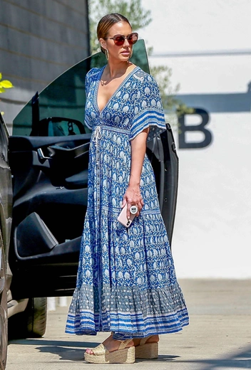 Нежно-голубой цвет, ненавязчивый принт, стиль бохо, макси длина и V-образный вырез – отличный выбор для шопинга жарким августовским днем. Джессика Альба дополнила наряд плетеной сумкой, эспадрильями на внушительной танкетке и солнцезащитными очками как главным must-have яркого лета. Еще не поздно взять на вооружение.