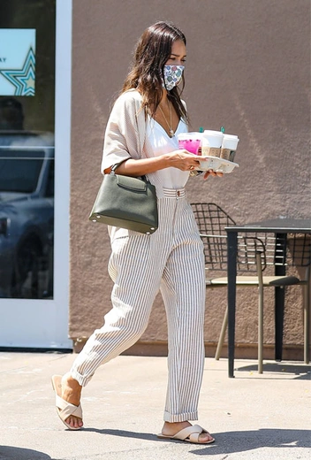 Каждый новый образ Джессики Альбы модные критики принимают с особым теплом. Звезда не так часто появляется на публике, но при этом всегда выглядит безупречно. И неважно, шопинг это или прогулка с детьми – на каждый провод у актрисы есть свое удачное решение. Недавно знаменитость засняли в Лос-Анджелесе у кофейни, где она покупала напитки себе и близким. Для выхода актриса решила выбрать максимально нейтральный и вневременной наряд: легкий костюм в полоску, бельевой топ, плетеные шлепанцы и миниатюрную оливковую сумку.