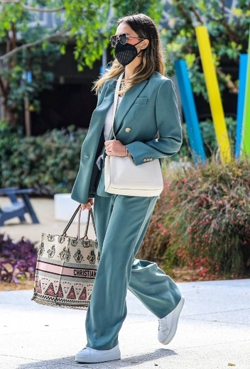 Для деловых вылазок в город Джессика Альба традиционно выбирает брючный костюм, который стильно смотрится в любых жизненных ситуациях. Правда, с приходом теплых деньков, знаменитость меняет базовую палитру оттенков на более яркие варианты, пробуждающие к жизни и стилю. Один из любимых тонов актрисы — благородный серо-голубой, который замечательно гармонирует с оттенком волос звезды. Джесс дополняет лук вещами в оттенках белого: майкой, кроссовками и сумкой через плечо.