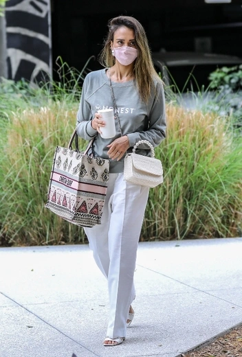 Лето практически дышит в спину, поэтому городские модницы уже вовсю настраиваются на круизный сезон и подготавливают к нему свои гардеробы. Даже в деловом стиле знаменитостей уже чувствуются свободолюбивые нотки и желание выйти за рамки дресс-кода. Например, Джессика Альба переходит с выдержанных брючных костюмов на более повседневное сочетание белых брюк, светло-серого джемпера и элегантных мюли в тон низа. Знаменитость дополняет лук сумкой-тоут от Christian Dior и плетеной мини-сумкой в кремовом оттенке. Аутфит завершают защитная маска и минималистичные украшения.