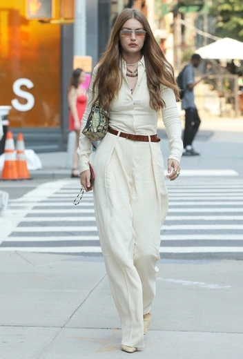 В этом году у Джиджи Хадид не получилось блеснуть на главном киномероприятии года и составить негласную конкуренцию своей младшей сестре Белле. В недавнем интервью супермодель призналась, что сейчас она хочет посвящать как можно больше времени воспитанию дочери Хай и совсем не торопится возвращаться в моделинг. Впрочем, это не мешает знаменитости устраивать яркие стритстайл-проходы в модной столице США и оставаться на волне трендовой повестки. Для летнего моциона Джиджи выбирает расслабленную комбинацию из рубашки и брюк в кремовом оттенке, которую дополняют белые остроносые туфли в тон наряда и разноцветная сумка на одно плечо. Аутфит завершают массивные украшения и солнцезащитные очки.