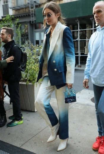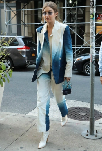 Сезон ярких оттенков и цветовых экспериментов прошел вместе с летом, но для американской супермодели он все еще продолжается: на выходных Джиджи украсила стритстайл Нью-Йорка ярким выходом в бело-голубом брючном костюме с локальным градиентом. В итоге, у звезды получился полноценный total-look, который дополнили белые полусапожки в трендовом белом оттенке, мини-сумочка в тон образу и очки со светло-голубыми линзами.