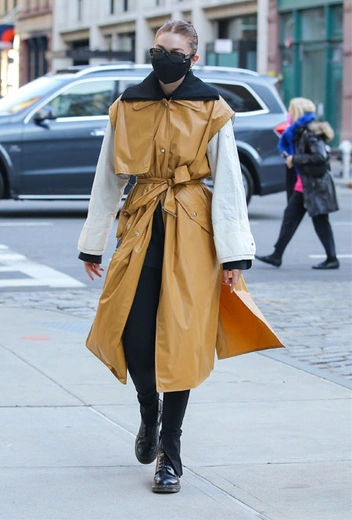 Последнее время модель появляется на публике все чаще и чаще – конечно, по известному всему миру поводу. Теперь звезда с завидной регулярностью выходит на прогулку со своей дочерью и заодно показывает, каким стильным и разнообразным может быть гардероб молодой мамы. Накануне она предстала в модном небесно-голубом тренче, а теперь решила выбрать более авангардный вариант с контрастными молочными рукавами и необычным воротником. Чтобы образ выглядел гармонично, Джиджи решила дополнить его нейтральными вещами – леггинсами с разрезами и грубыми ботинками.