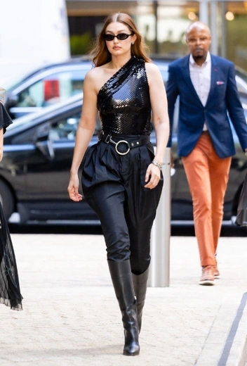 С рождением ребенка карьера старшей Хадид приостановилась: молодая мама решила на некоторое время всецело посвятить себя воспитанию малышки Хай, но не прошло и года, как Хадид возвращается в фэшн-мир и делает это очень эффектно. На днях красотка продефилировала на одну из очередных съемок по улицам Нью-Йорка в роскошном образе в тотальном черном: девушки примерила комбинацию блестящего топа, брюк-парашютов и высоких сапог в черной гамме. Джиджи дополнила лук солнцезащитными очками и одиночным браслетом.