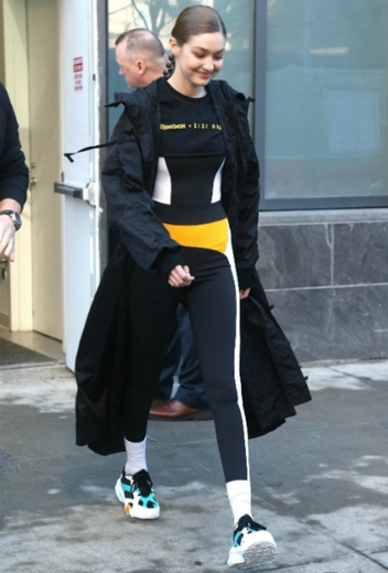 Джиджи всегда не прочь приодеться в аутфит, на котором есть отпечаток спортивного стиля, пусть это и выразится только в выборе очков. Этот лук — прямое наследие современной фитнес-культуры, которая предлагает облачаться в треники, велосипедки и другие атрибуты активного образа жизни для прогулки по магазинам, встречи с друзьями и даже более официальных мероприятий. Надо отдать должное: на Джиджи спортивные костюмы смотрятся как вылитые
