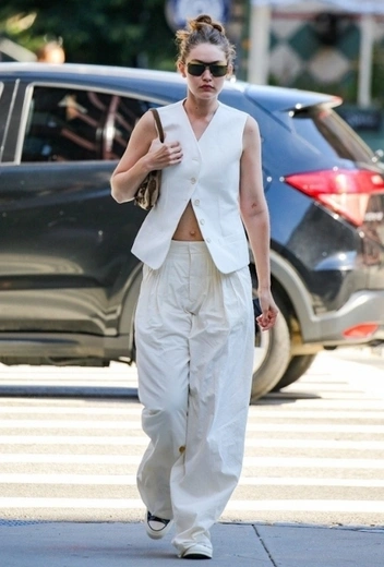 Молодая мама Джиджи Хадид почти все свое время проводит в компании семьи, мужа и дочери Хай. Однако иногда супермодель находит время для ярких стритстайл-выходов и заметно освежает светскую фэшн-хронику своими аутфитами. На этот раз Джиджи предлагает свою интерпретацию городского стиля: знаменитость удачно миксует элементы делового и casual-гардероба и не спешит расставаться с летним total-white даже по окончании теплого сезона. Звезда подиумов примеряет брючную комбинацию с полузастегнутым жилетом, дополненную черными конверсами, коричневой сумкой на одно плечо и солнцезащитными очками.