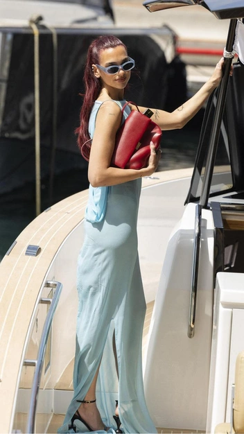 Если вам наскучила черно-белая или пастельная палитра, тогда присмотритесь к новому образу Дуа Липы — на мероприятии модного Дома Jacquemus она появилась в бесподобном наряде с самым стильным сочетанием оттенков. Певица примерила полупрозрачное голубое платье с разрезом и подобрала к нему темное белье. Акцент она сделала на красном клатче и завершила роскошный выход черными босоножками и очками с голубой оправой.