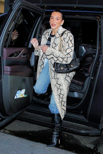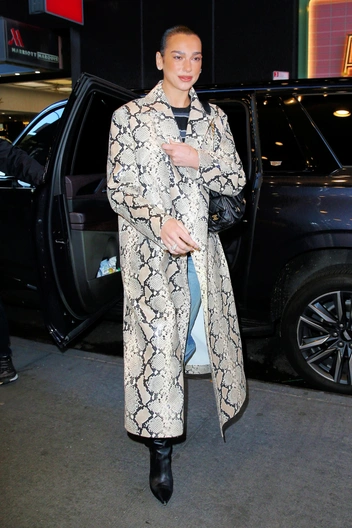 В трендах 2024 года были анималистичные принты, и змеиный — куда менее популярный, чем леопардовый. Под конец года Дуа Липа решила выгулять тренч, который дополнила светлыми джинсами, ботфортами с узким мысом и сумкой Chanel.