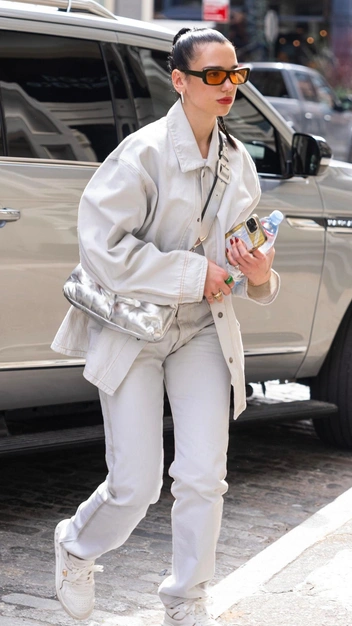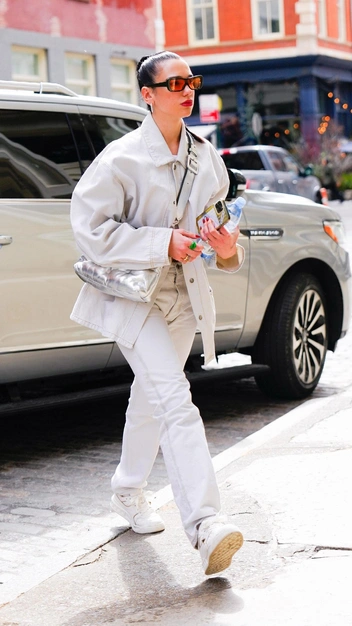 Певица появилась в стильном аутфите в серо-белом оттенке, который выглядит эффектно и дерзко. Звезда надела топ в рубчик, светлые джинсы и объемную рубашку с акцентными пуговицами. Дополнила она выход классическими кроссовками, серебристой сумкой с эффектом металлик и солнцезащитными очками с цветными стеклами в стиле нулевых.