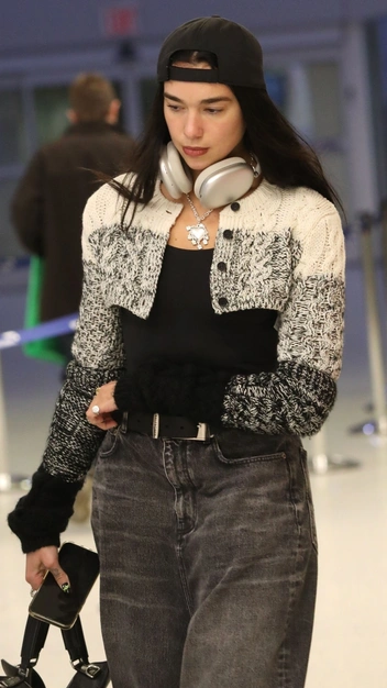 Дуа Липа показала, как гармонично сочетать сразу несколько модных тенденций в одном луке. Звезда надела широкие джинсы серого оттенка, черный топ и укороченный кардиган. Завершили образ аксессуары — кожаный ремень и бейсболка, надетая козырьком назад.