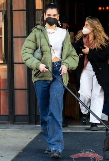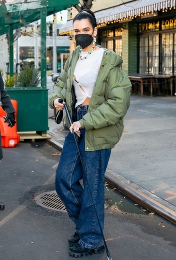 Дуа Липа всегда предпочитает неформальный стиль — как в повседневных выходах, так и в деловых. Ну, а если речь идет о шопинге или прогулке с любимым питомцем — тут исполнительница ни в чем себя не ограничивает и дает волю своему главному пристрастию к безразмерности и оверсайзу. На днях звезда выгуляла один из таких луков, который составили широкие джинсы, белый укороченный топ с разрезами и пуховик в зеленом оттенке. Аутфит дополнили массивные черные ботинки и колоритные акссесуары, удачно разнообразившие образ.