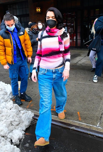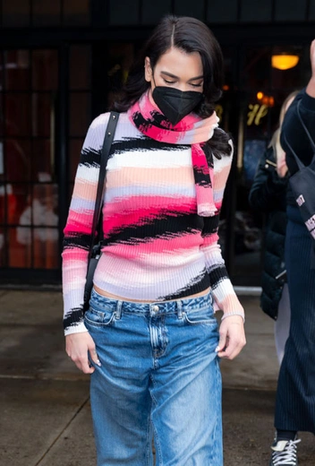 На сцене мы привыкли видеть певицу в ярких и эксцентричных сценических образах. Правда, и в повседневное время Дуа Липа не отказывается от модных тенденций и показывает стильные приемы, которые мы можем применить и к собственному гардеробу. Накануне она посетила шоу Saturday Night Live, и поклонники застали певицу на выходе из отеля. Девушка решила примерить практичный и комфортный образ: свитер с психоделическим принтом, шарф в тон, свободные брюки с заниженной талией в стиле нулевых и уютные угги, которые последнее время становятся все более и более популярными.