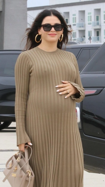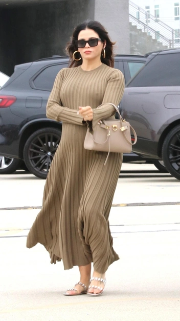 Прекрасное положение Дженна Дуан подчеркивает удобным и одновременно стильным луком. Актриса выбрала трикотажное платье оливкового оттенка длины миди с плиссированной юбкой, которое добавило образу непринужденности и женственности. А прекрасным вариантом для комфортных прогулок стали шлепанцы цвета металлик на плоской подошве с акцентными перемычками. Выход звезда дополнила массивными серьгами-конго и коричневыми очками прямоугольной формы, а также классической кожаной сумкой бежевого оттенка.