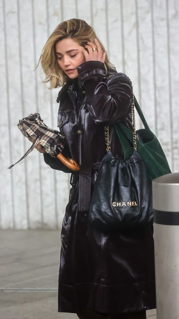 Дженна Коулман для выхода выбрала простой, но стильный аутфит, который сможет повторить каждая девушка. Звезда надела черный свитер, широкие коричневые брюки и кожаный плащ, ставший популярным в прошлом году. Завершила она образ аксессуарами: белыми кедами на платформе, шоппером, сумкой-мешком Chanel и минималистичным золотым кольцом.
