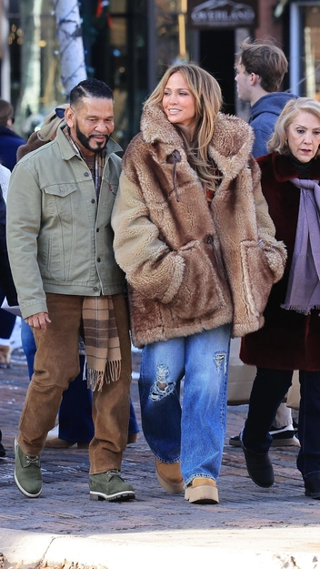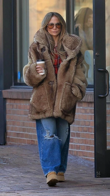 В преддверии Рождества весь свет знаменитостей собирается в Аспене — северном городе Америки, где царит особая рождественская атмосфера. Дженнифер Лопес не стала исключением. Певица отправилась за кофе в дубленке из овечьей шерсти модного коричневого оттенка Mocha Mousse. Образ дополнили угги на высокой подошве и широкие голубые джинсы.