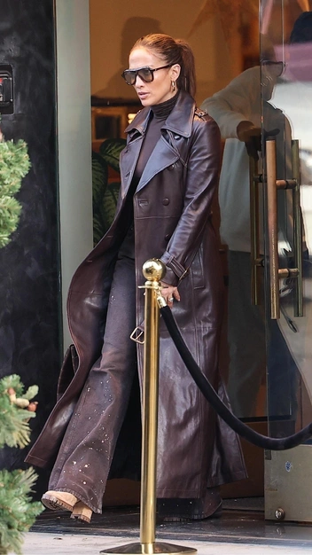 Дженнифер Лопес подтверждает тренд на коричневый цвет и демонстрирует стильный образ, который смело может повторять женщина в любом возрасте. Знаменитость примерила облегающий бадлон, который заправила в ультрамодные расклешенные джинсы с ржавым эффектом. Поверх она надела актуальный кожаный плащ и в тон к нему подобрала вместительную каркасную сумку. Завершили аутфит сапоги на тракторной подошве и солнцезащитные очки.